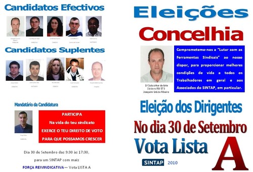 No próximo dia 30 (quinta-feira) de Setembro de 2010, os trabalhadores sindicalizados no SINTAP vão eleger os Dirigentes para a Concelhia artigo 67º dos Estatutos do SINTAP.