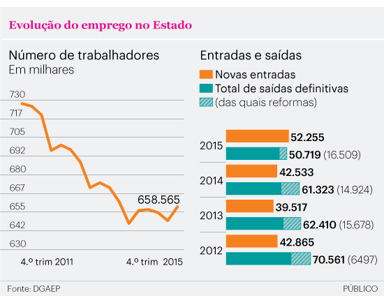 Em 2015, e pela primeira vez desde o início do resgate da troika, o número de funcionários públicos cresceu: números oficiais mostram que no final do ano passado, os organismos do Estado empregavam quase 660 mil pessoas (ainda assim, menos 69 mil do que em 2011).